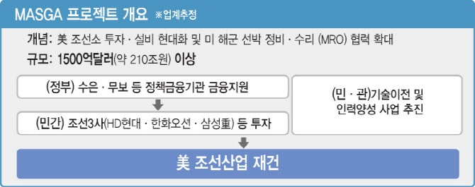 [이데일리 김국배 김나경 기자] 미국 조선업 재건 프로젝트인 ‘마스가(MASGA·미국 조선업을 다시 위대하게)’에 투자할 1500억 달러 상당 부분이 보증 형태로 이뤄질 전망이다.