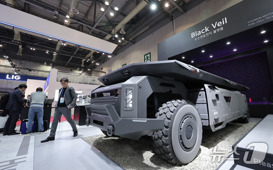2025년 10월20일 경기 고양시 킨텍스에서 열린 서울국제항공우주 및 방위산업 전시회 'ADEX 2025'에서 현대로템 부스를 찾은 관람객들이 수소연료전지 기반 무인 …