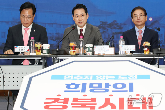 장동혁 국민의힘 대표가운데가 일 오후 경북 안동시 경북도청에서 열린 대구·경북 지역민생 예산정책협의회에서 인사말을 하고 있다. 왼쪽부터 송언석 원내대…