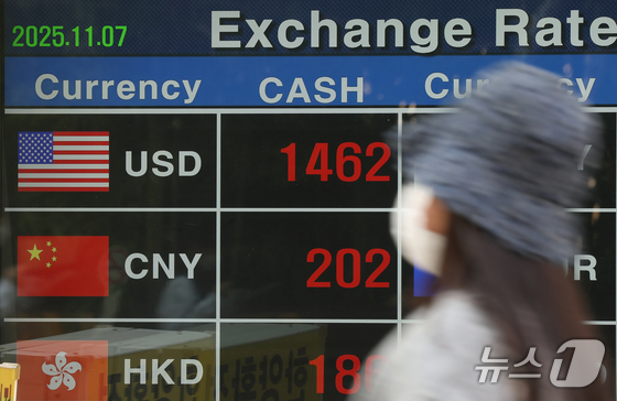 7일 오후 서울 중구 명동의 한 환전소 앞 전광판에 환율이 표시되고 있다. 2025.11.7/뉴스1 News1 권현진 기자달러·원 환율이 장중 146…