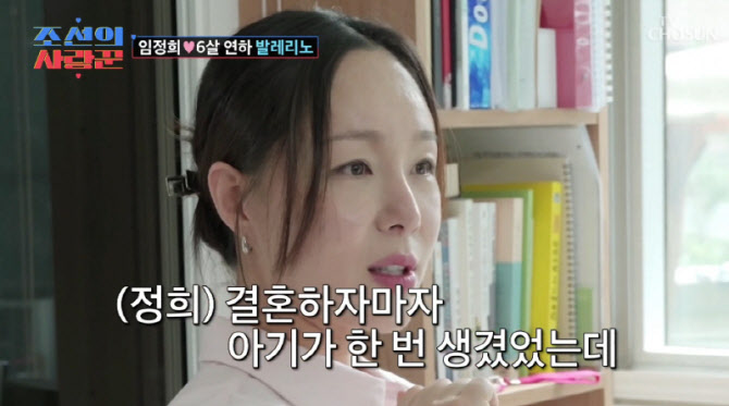 [이데일리 스타in 최희재 기자] 가수 임정희가 과거 유산 경험을 털어놨다. (사진=TV조선 방송화면) 지난 3일 방송한 TV조선 ‘조선의 사랑꾼’에는 가수 임정희와 6세 연하 발