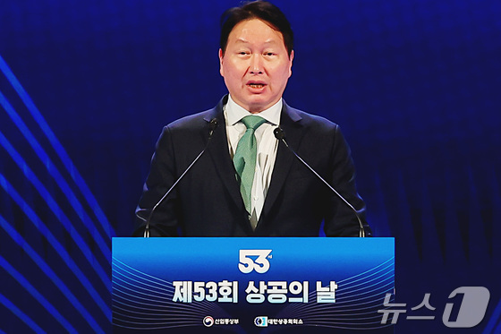최태원 대한상의 회장이 31일 서울 중구 대한상공회의소에서 열린 '제53회 상공의 날 기념식'에서 축사하고 있다. 2026.3.31 뉴스1 조연우 인턴기자…