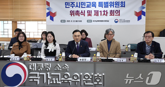 차정인 국가교육위원회 위원장이 22일 서울 종로구 정부서울청사에서 열린 민주시민교육 특별위원회 위촉식 및 제1차 회의에서 모두발언을 하고 있다. 2025.12.22/뉴스…