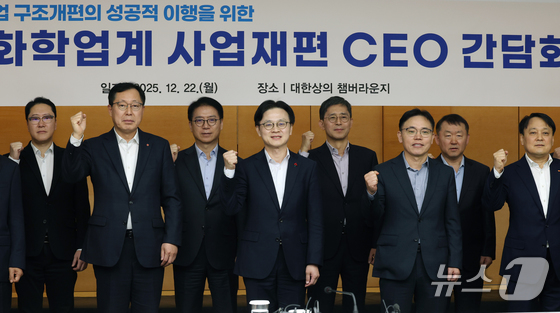 김정관 산업통상부 장관이 22일 서울 중구 대한상공회의소에서 열린 석유화학업계 사업 재편 CEO 간담회에서 참석자들과 기념촬영을 하고 있다. 김 장관은 이 자리에서 LG…