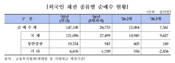 금투협 제공3월 중동 지역의 지정학적 리스크 심화로 국내 채권시장에서 외국인 투자자들의 채권 보유잔고가 역대 최대폭으로 감소했다.13일 금융투자…