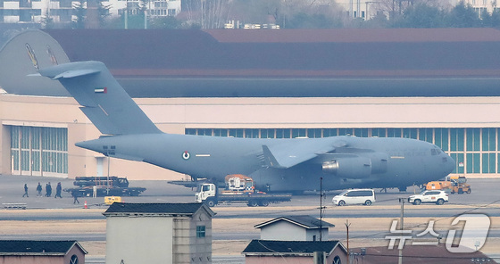 지난달 9일 오후 대구공항에서 관계자들이 아랍에미리트UAE C-17 수송기에 천궁-Ⅱ 유도탄으로 추정되는 물자를 싣고 있다. 2026.3.9 ©…