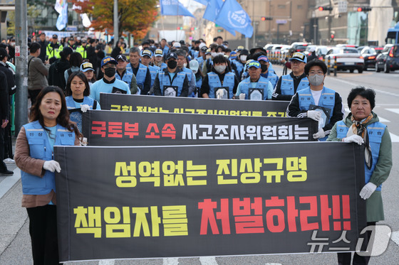 . 무안공항 제주항공 여객기 참사 유가족들이 일 오후 서울 용산구 용산역 앞에서 진상규명과 책임자 처벌, 정보공개 등을 촉구하며 대통령실을 향해 행진하고 있다.…