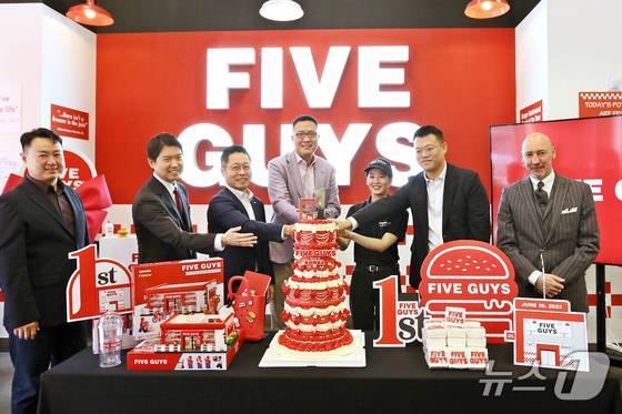 김동선 한화갤러리아 부사장왼쪽 네 번째이 지난해 6월26일 서울 서초구 파이브가이즈 강남에서 열린 파이브가이즈 국내 오픈 1주년 기념 행사에서 기념 케…