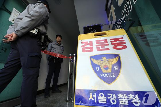지난 4일 서울 강동구 천호동의 한 재개발조합 사무실에서 흉기 난동 사건이 발생, 경찰이 출입구에 폴리스라인이 설치한 채 출입을 통제하고 있다. 2025.11.4/뉴스1…