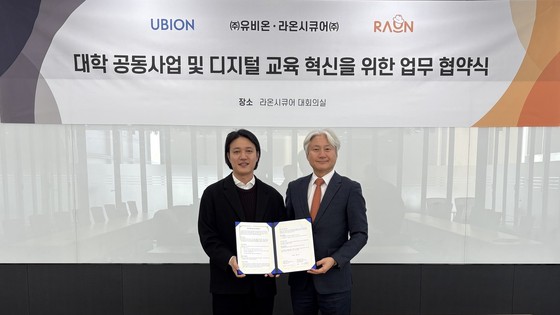 좌측부터 오병주 유비온 전무와 윤원석 라온시큐어 부사장이 대학 공동사업 및 디지털 교육 혁신을 위한 업무협약MOU’을 체결한 후 기념…