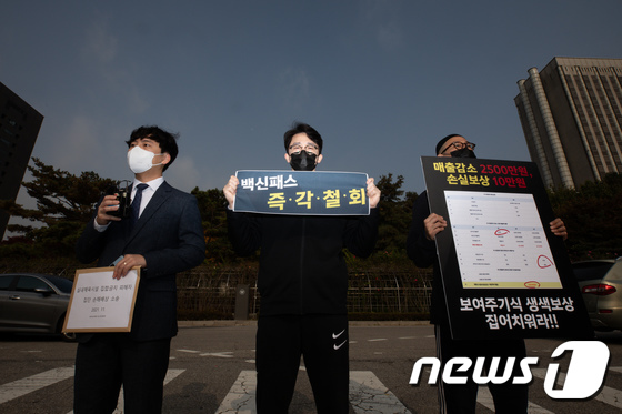 대한실내체육시설 총연합회 회원들이 4일 서울 서초구 중앙지법 앞에서 기자회견을 열고 실내체육시설 집합금지 피해자 집단 손해배상 소송을 밝히고 있다. 2021.11.4/뉴…