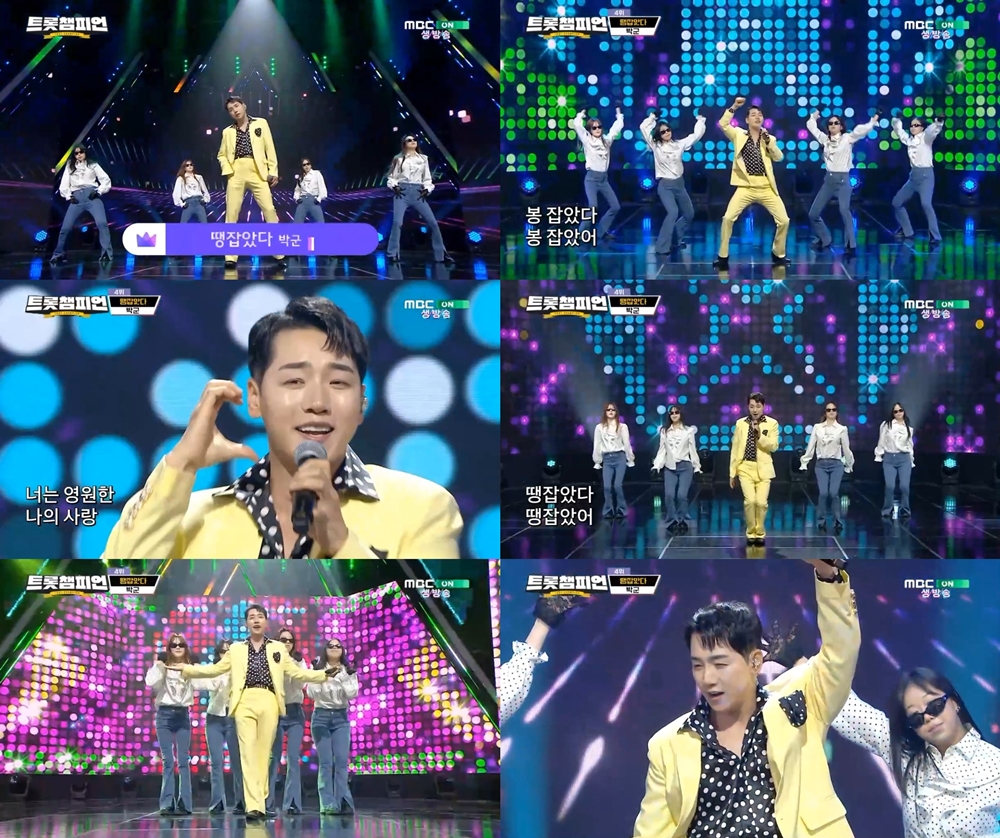 토탈셋의 박군이 신바람 나는 무대로 시청자들에게 기분 좋은 에너지를 선사했다. 박군은 지난 9일 방송된 MBC ON '트롯챔피언'에 출연해 신곡 '땡잡았다' 무대를 선보였다. 이날