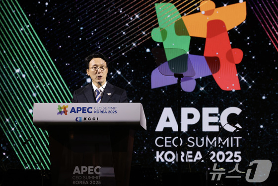김민석 국무총리가 일 경주 화랑마을 어울마당에서 열린 ‘ APEC CEO 서밋’의 첫 번째 공식 행사인 환영 만찬에서 축사를 하고 있다. ‘ APEC …