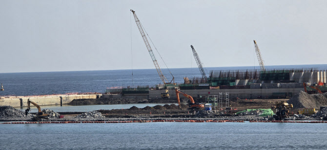 [울릉=이데일리 이다원 기자] 머리 위로 해가 막 떠오른 지난 6일 아침, 경상북도 울릉군 사동항 일대에 조성 중인 울릉공항 건설 현장은 해상 방파제 너머로 산등성이를 깎아 만든