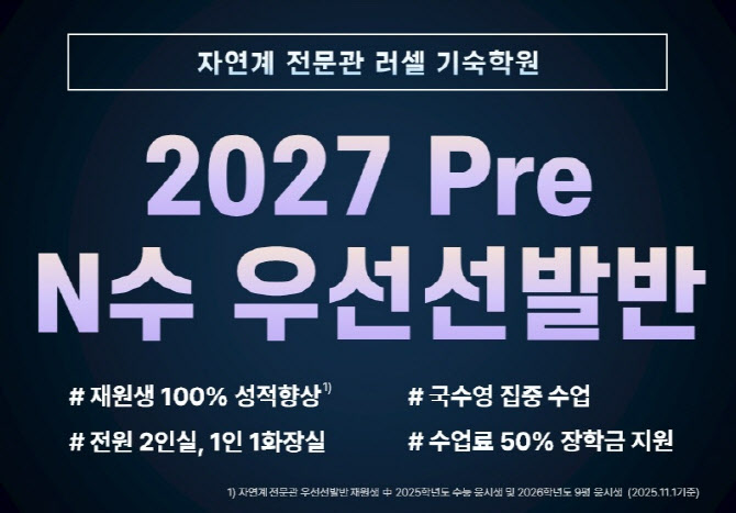 [이데일리 이윤정 기자] 자연계 전문관 러셀 기숙학원은 2027 수능 준비를 위한 ‘2027 Pre N수 우선선발반’을 모집한다고 12일 밝혔다. 2027 Pre N수 우선선발반은