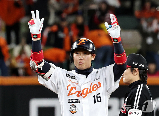 31일 대전 한화생명볼파크에서 열린 프로야구 2025 신한 SOL뱅크 KBO 포스트시즌 한국시리즈 5차전 LG 트윈스와 한화 이글스의 경기, 2회말 무사 1루 한화 하주…