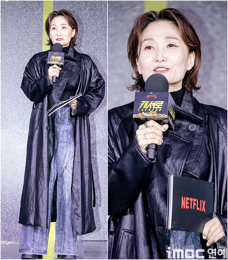 MC 박경림이 22일 오전 서울 강남구 웨스틴 파르나스 호텔에서 열린 넷플릭스 시리즈 ‘캐셔로’ 제작발표회에 참석해 진행을 하고 있다. ‘캐셔로’는 결혼자금, 집값에 허덕이는 월급