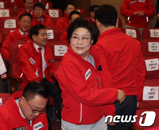 이혜훈 국민의힘 중성동을 후보가 19일 서울 여의도 국회에서 열린 제22대 총선 중앙선대위 발대식 및 공천자대회에 참석하고 있다. 2024.3.19/뉴스1 …
