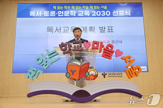 18일 광성중에서 열린 '책 읽는 학교, 책 읽는 마을, 책 읽는 서울' 비전선포식에서 정근식 서울시교육감이 발표하고 있다.서울시교육청 제공정근…