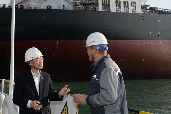 황기연 한국수출입은행장왼쪽이 19일 경남 창원에 위치한 케이조선을 찾아 김찬 대표와 대화를 나누고 있다수출입은행 제공.황기연 …