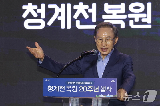이명박 전 대통령이 1일 오후 서울 중구 청계광장에서 열린 청계천 복원 20주년 기념식에서 축사를 하고 있다. 2025.10.1/뉴스1 News1 안은나 기…