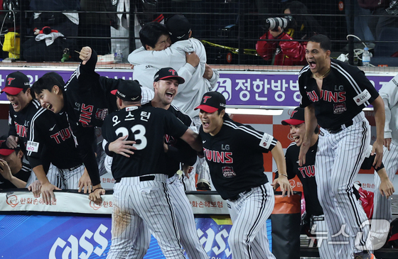 일 대전 한화생명볼파크에서 열린 프로야구 신한 SOL뱅크 KBO 포스트시즌 한국시리즈 차전 LG 트윈스와 한화 이글스의 경기에서 승리한 LG 선수들이 환호…
