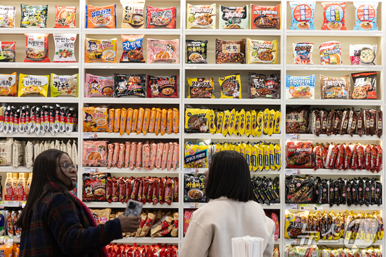 서울 마포구 CU 홍대상상점 라면 라이브러리를 찾은 외국인들이 라면을 살펴보고 있다. /뉴스1 News1'K-푸드' 성장세는 어디까지일까.아시아를 …