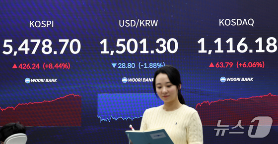 코스피가 급등하며 5400선을 회복 마감한 1일 오후 서울 중구 우리은행 딜링룸 현황판에 코스피지수가 전장대비 426.248.44% 상승한 5,478.…