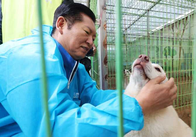 정청래 더불어민주당 대표가 취임 100일을 맞이한 9일 경기도 용인시 처인구 백암면에 위치한 유기견 보호소 ‘행복한 강아지들이 사는 집’에서 봉사활동을 하고 있다. 정 대표는 그동