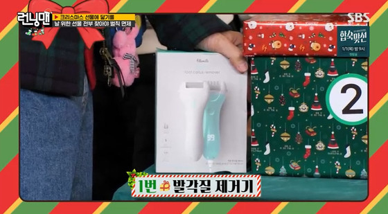'런닝맨' 방송 캡처'런닝맨' 발뒤꿈치 각질 제거기가 등장하자 지석진이 타깃이 되며 웃음을 자아냈다.21일 오후 방송된 '런닝맨'은 크리스마스 특집으로 꾸며졌다.…